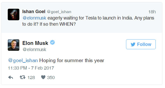 Tesla’s, Elon Musk may just have piqued the interest of automakers and car enthusiasts in India with a casual tweet to a query on when it plans to open a Tesla unit in India. Responding to Ishan Goel’s question on the micro-blogging site, founder and CEO Musk hinted at a possible India launch as early as summer of 2017. “Hoping for summer this year,” was his straight reply.